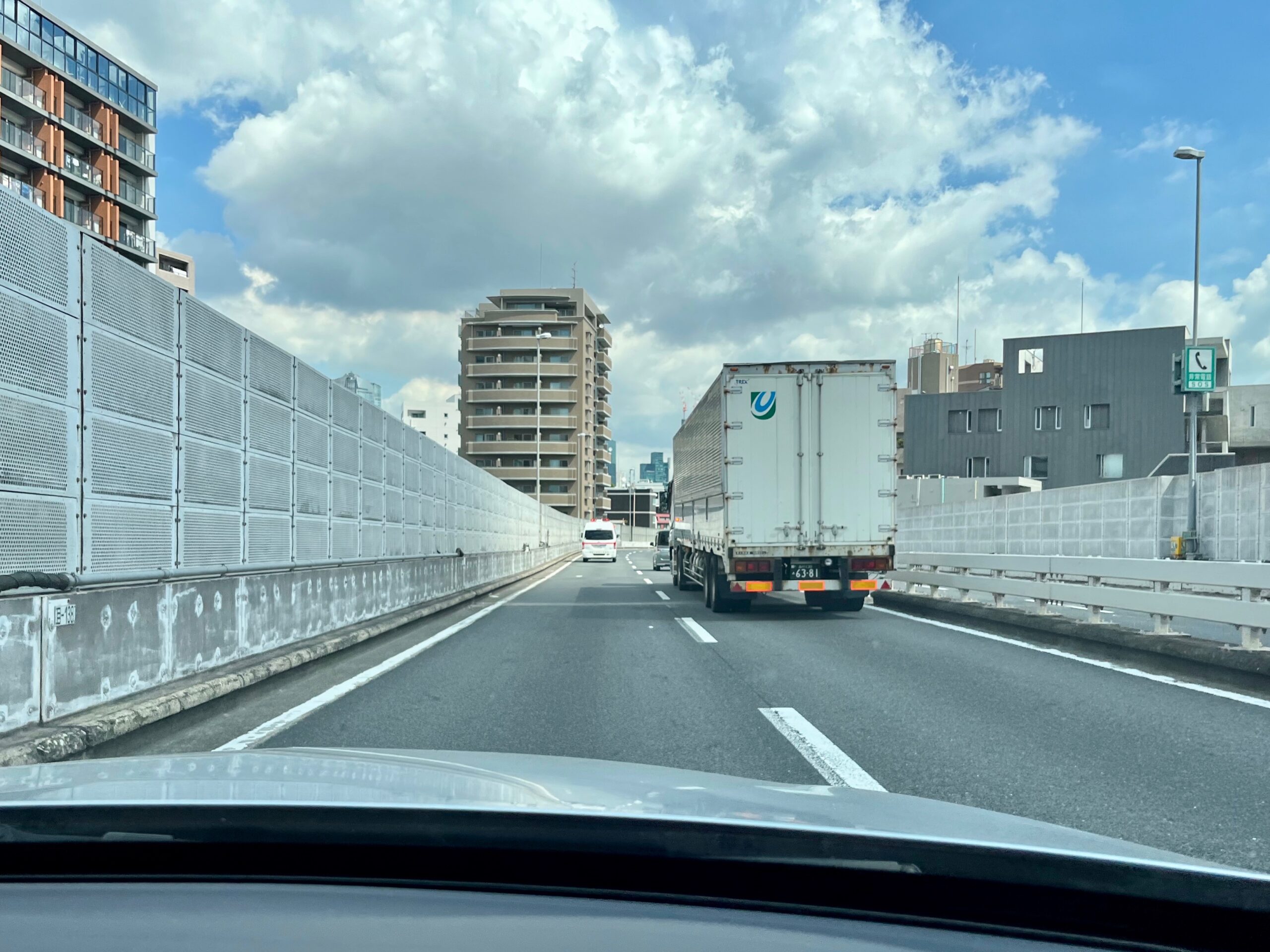 東京を朝10時14分に自宅から出発して、荏原から首都高に入る。前の車は、救急車だ。救急車も首都高速を走るのね。