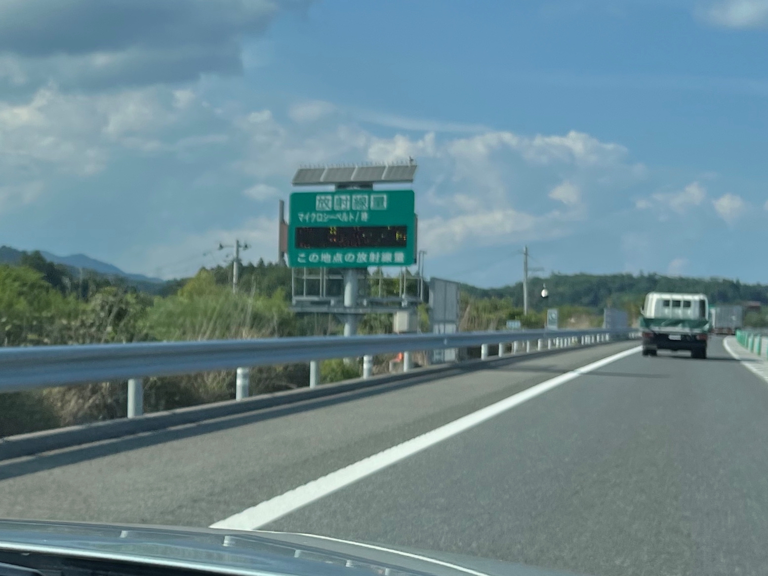 福島県に入ると、何やら見慣れない標識が現れた。「放射線量」と題して、「この地域の放射線量」が「マイクロシーベルト/時」で表示される。数キロ置きに設置されていて、最初は0.1だったのが、順に0.2、0.3、0.4、0.5と上がっていく。