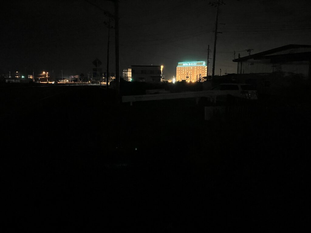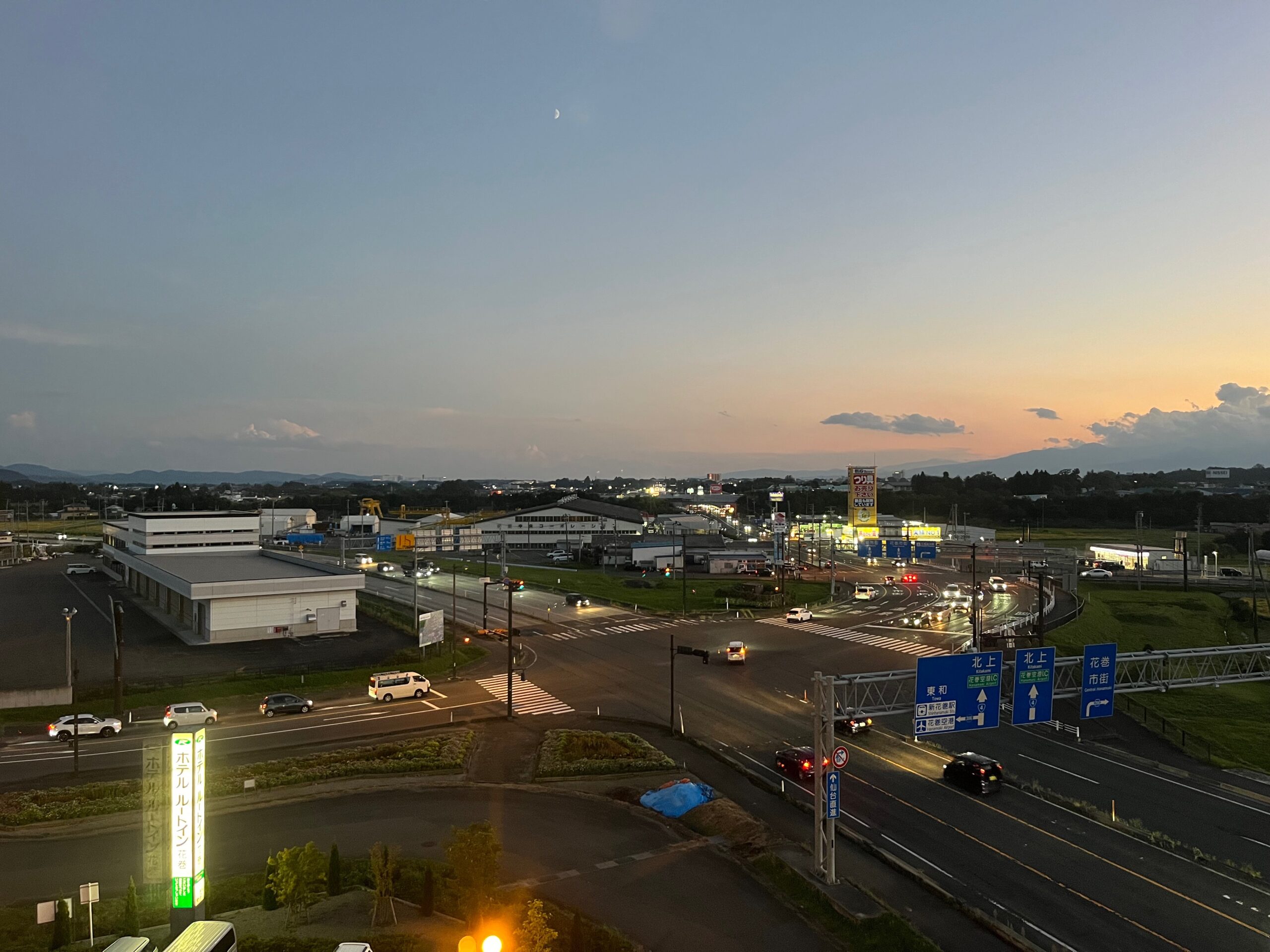 ホテルからの眺め。見えないけれど、左後ろ側が花巻空港で、正面は花巻市中心地方向である。繁華街があるわけではないので特に明るくは見えない。