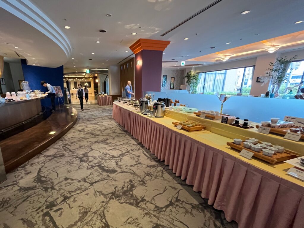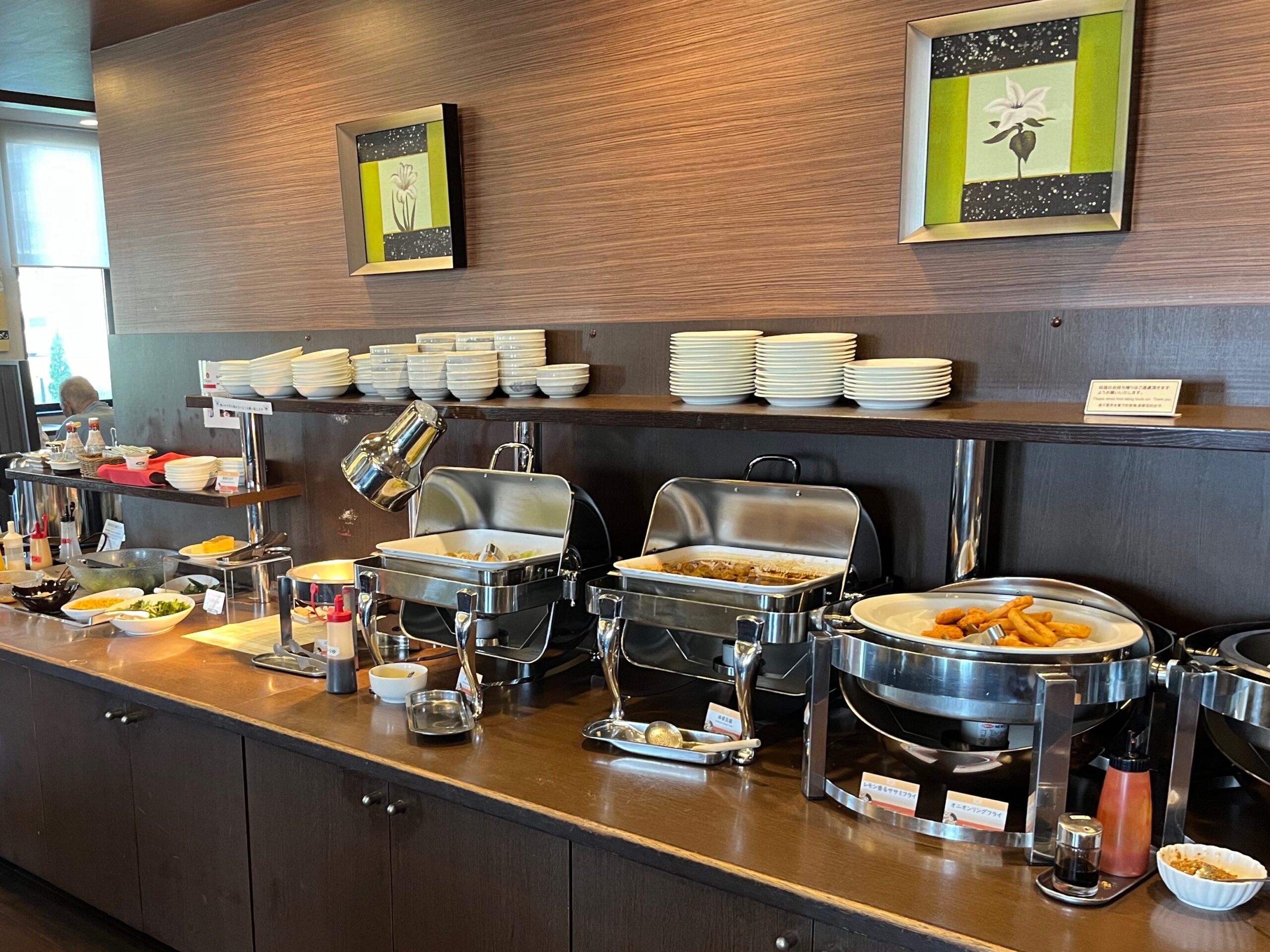 朝ごはんのビュッフェ。窓の外は駅前で、通勤している人が駅に向かって歩いていくのがちらほらと見える。