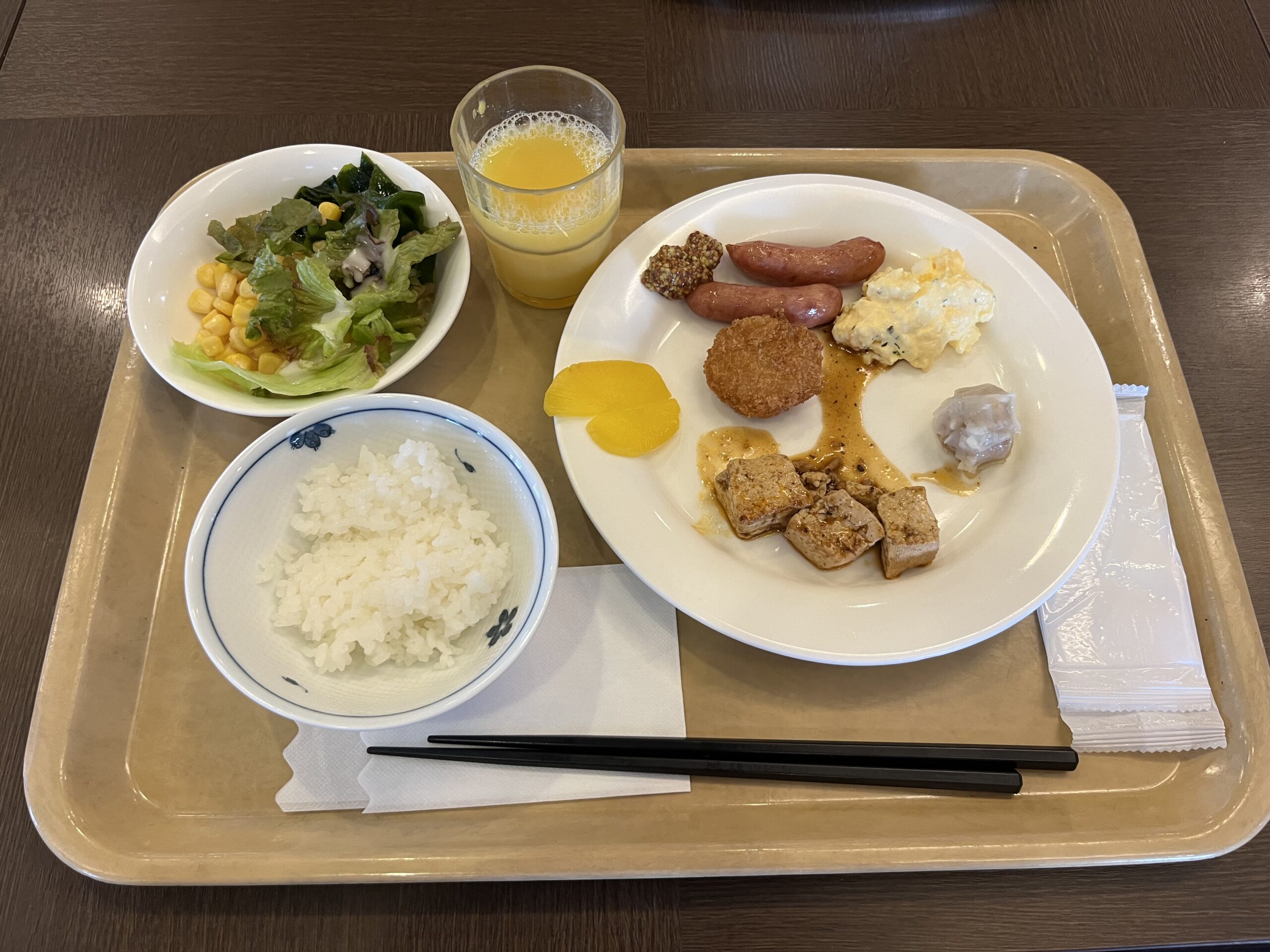レタスとコーンのサラダ。定番のソーセージ、麻婆豆腐、シュウマイ、ポテトサラダ、ささみフライ(と書いてあったがチキンナゲットだった)、ご飯、オレンジジュース。