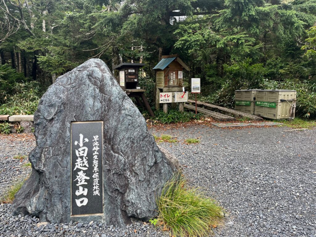小田越登山口に到着。河原の坊駐車場から約2.1kmでコースタイムでは45分。標高差は210mくらいだ。
