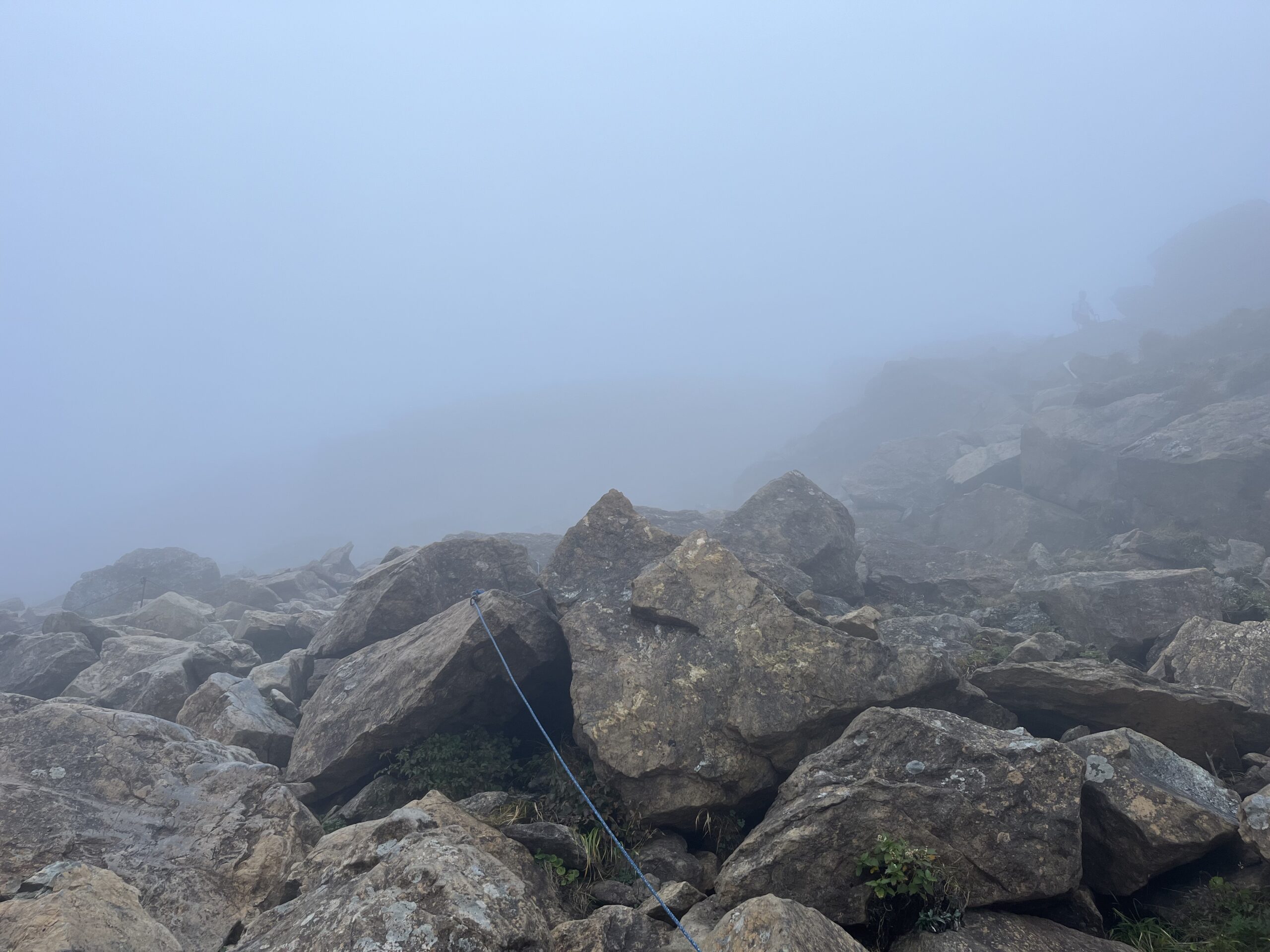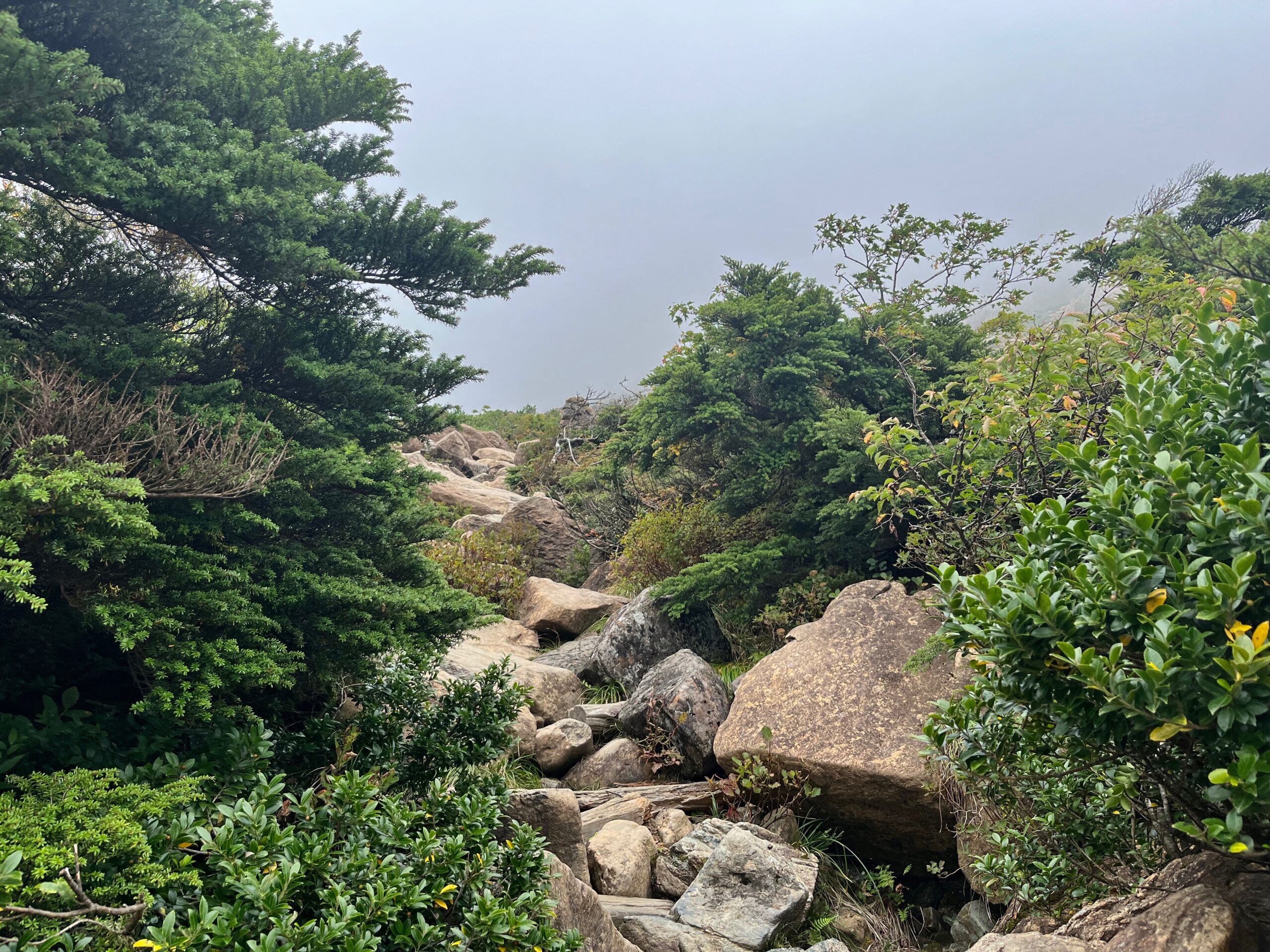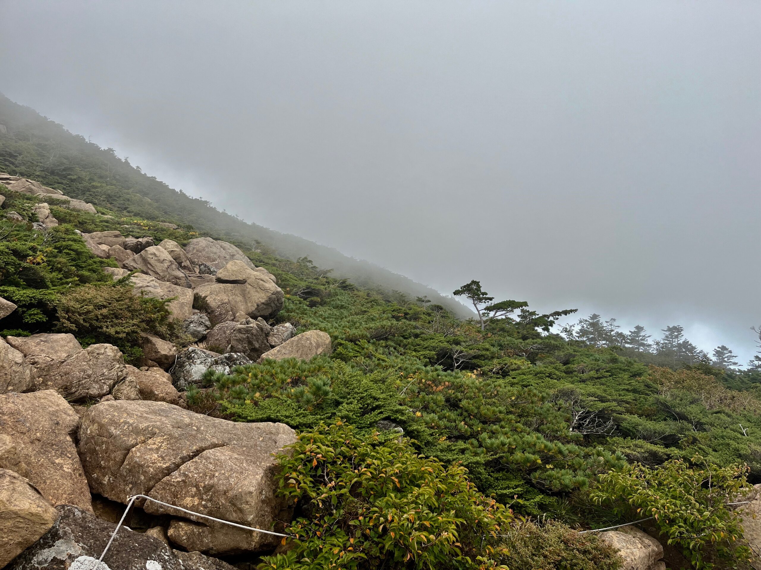 岩が多い。ガスが出ていて、50mより先は良く見えない。ここまでは木が生えている。