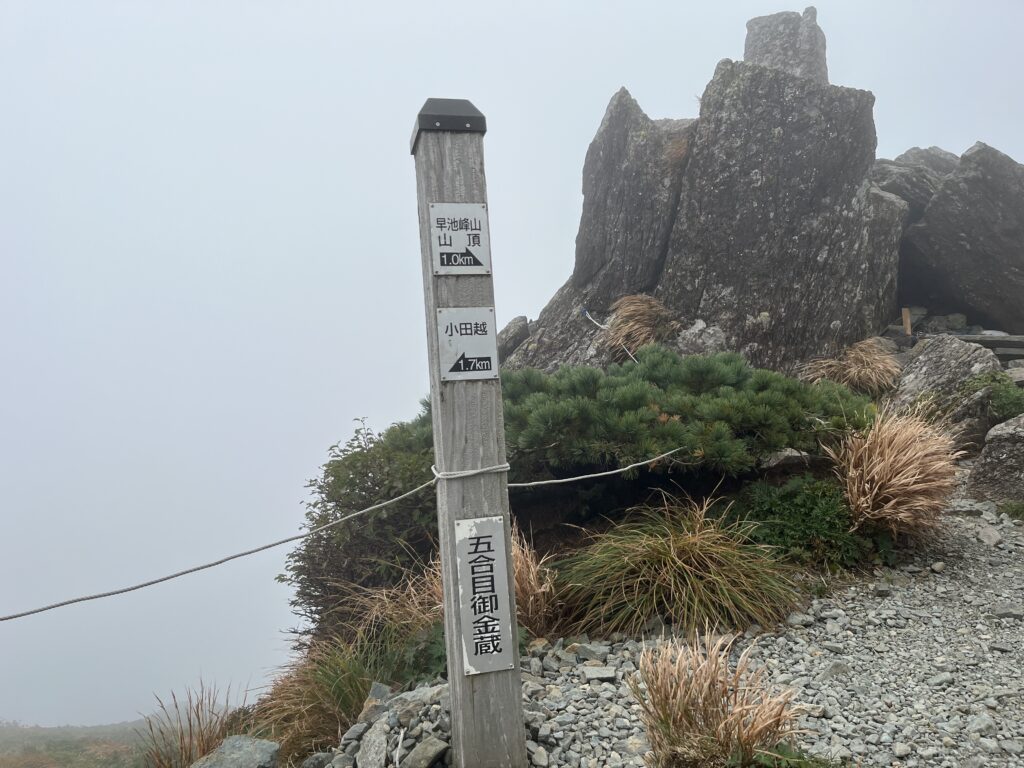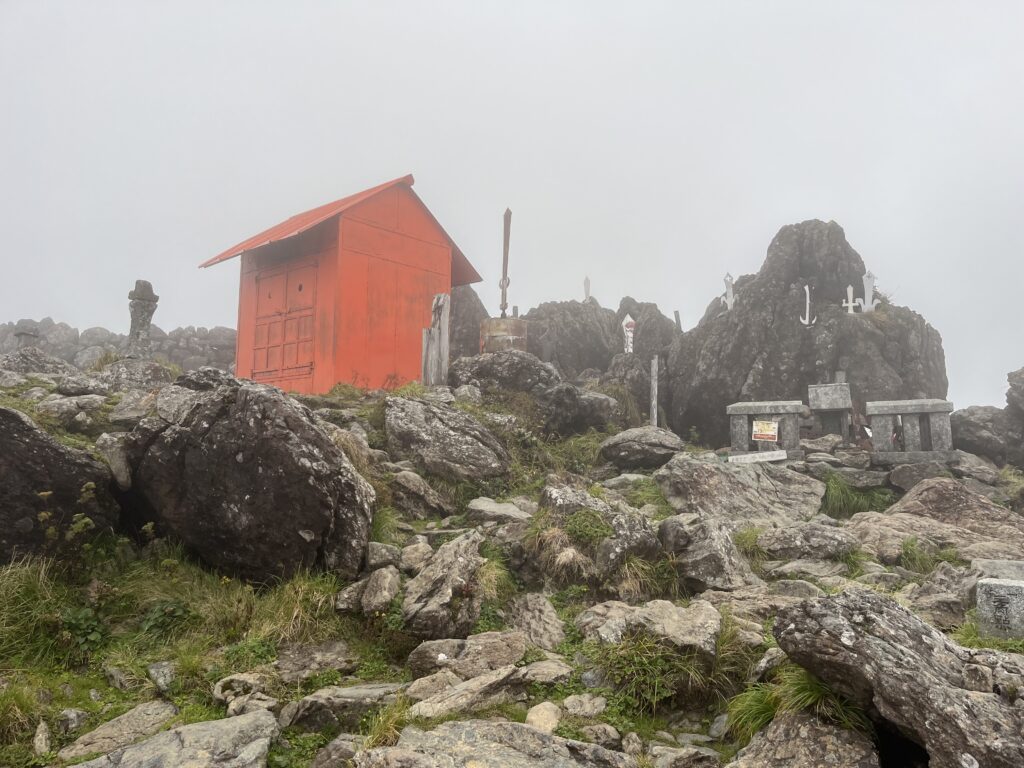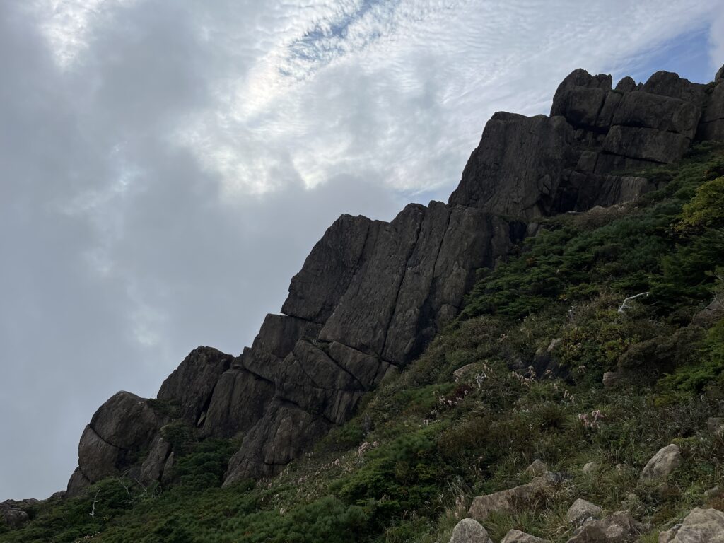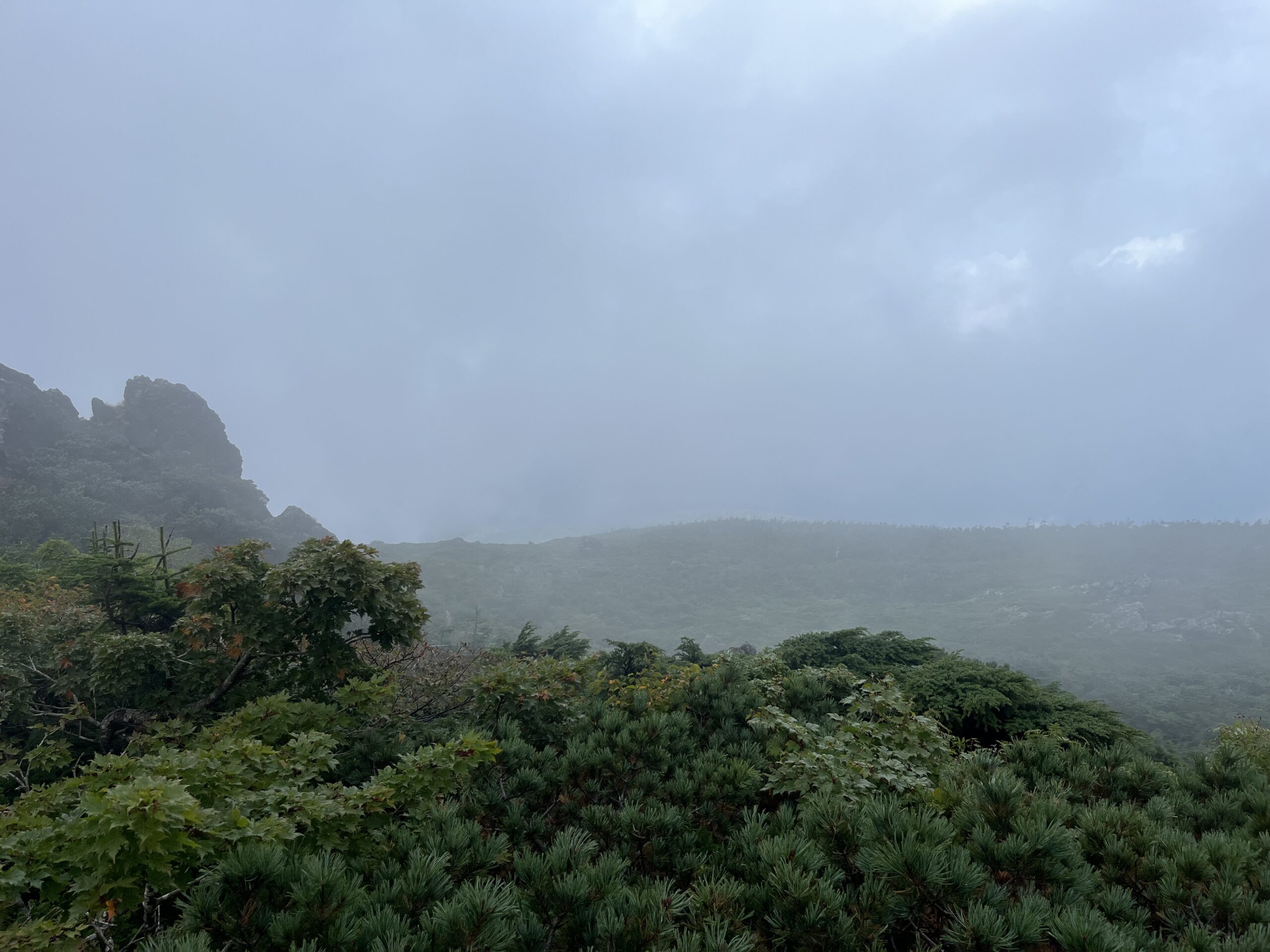 岩が多い。ガスが出ていて、50mより先は良く見えない。ここまでは木が生えている。