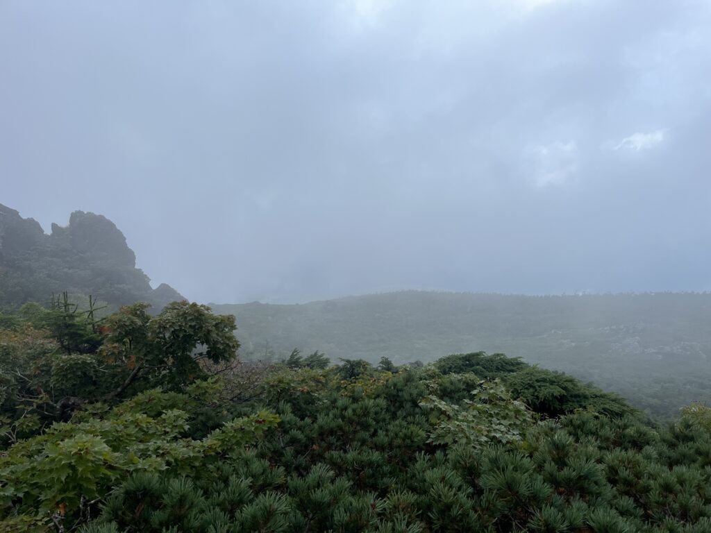 晴れないかなあ。雲は厚いけれど、この山の表面にだけぴったり張り付いている感じだ。