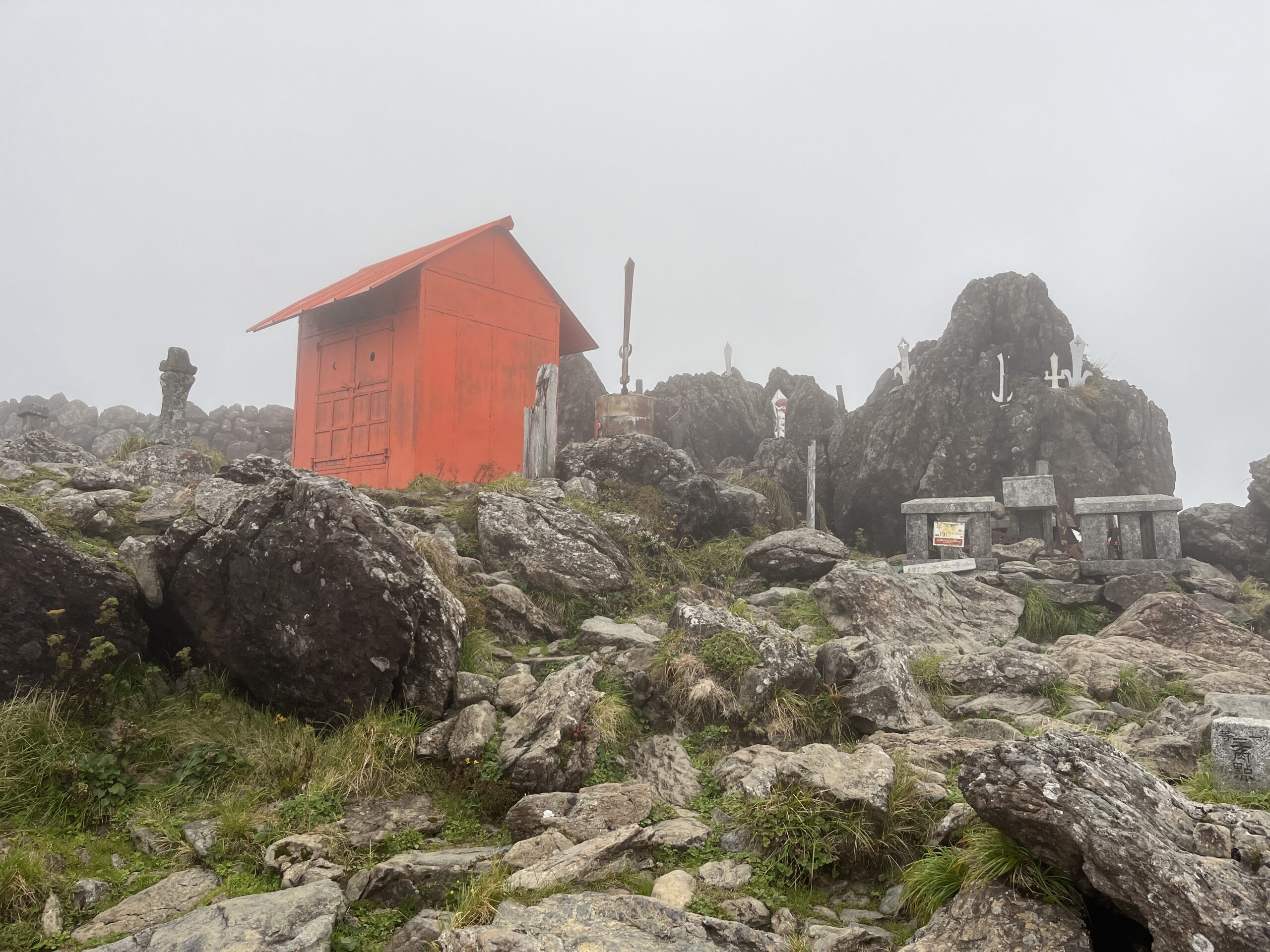 樹林帯を抜けるちょっと前に小さな一人用テントがあって、携帯トイレ専用のトイレとなっていた。山頂には立派な避難小屋があり、トイレも3個あるけれども、それらは全て携帯トイレ専用となっていた。