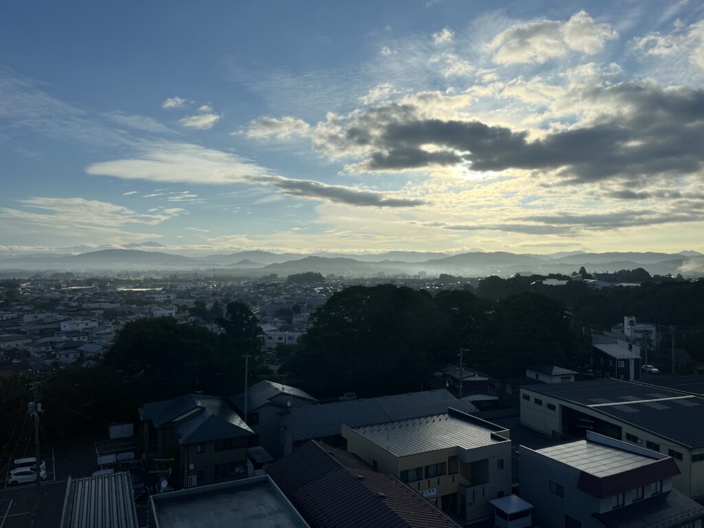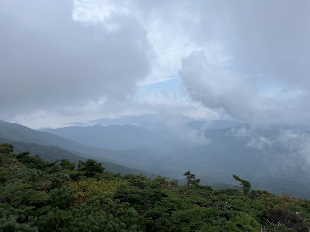 ホテルの朝。左奥が早池峰山方向である。やはり早池峰山は雲が多い。