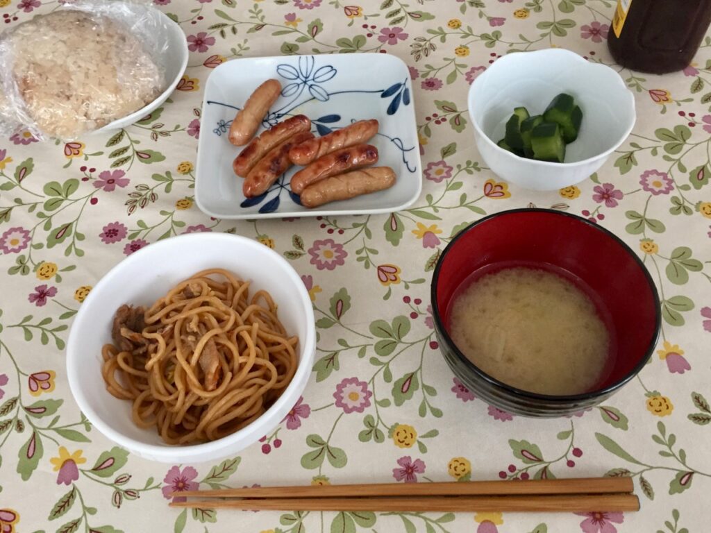 2021/04/27 昼 – 焼きそば、ソーセージ、味噌汁、ぬか漬け