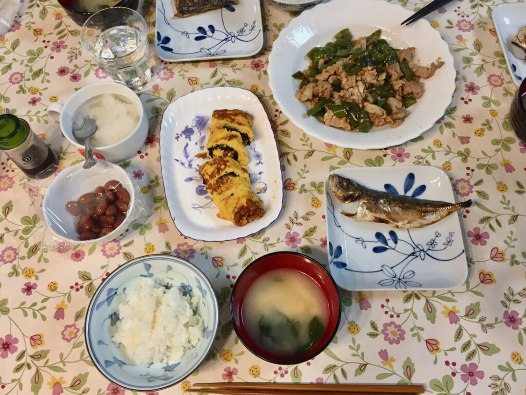 2021/04/25 晩 – 豚肉とピーマンの炒め物、アジ干物、海苔卵焼き、味噌汁、金時豆、ご飯