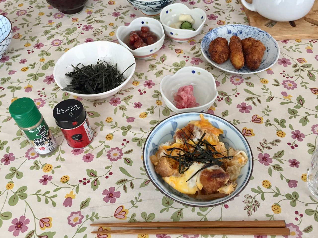 2021/04/30 昼 – ささみフライとあぶらげ丼、ささみフライ、玉ねぎのマリネ
