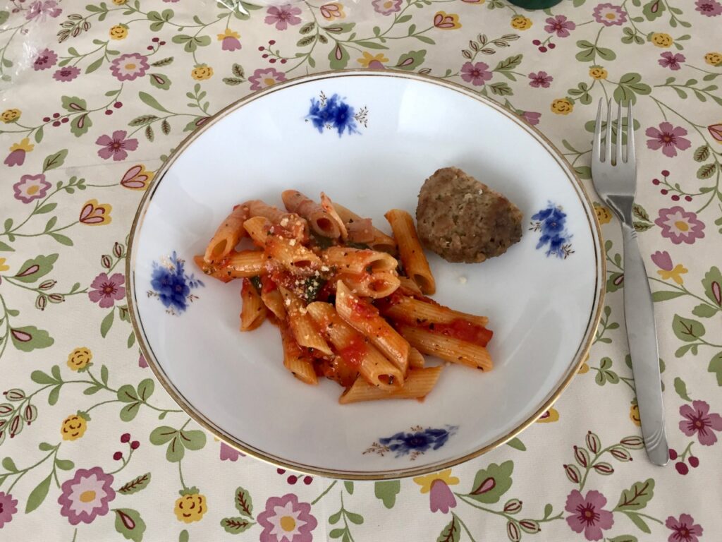 2021/04/24 昼 – トマトペンネ、ハンバーグ
