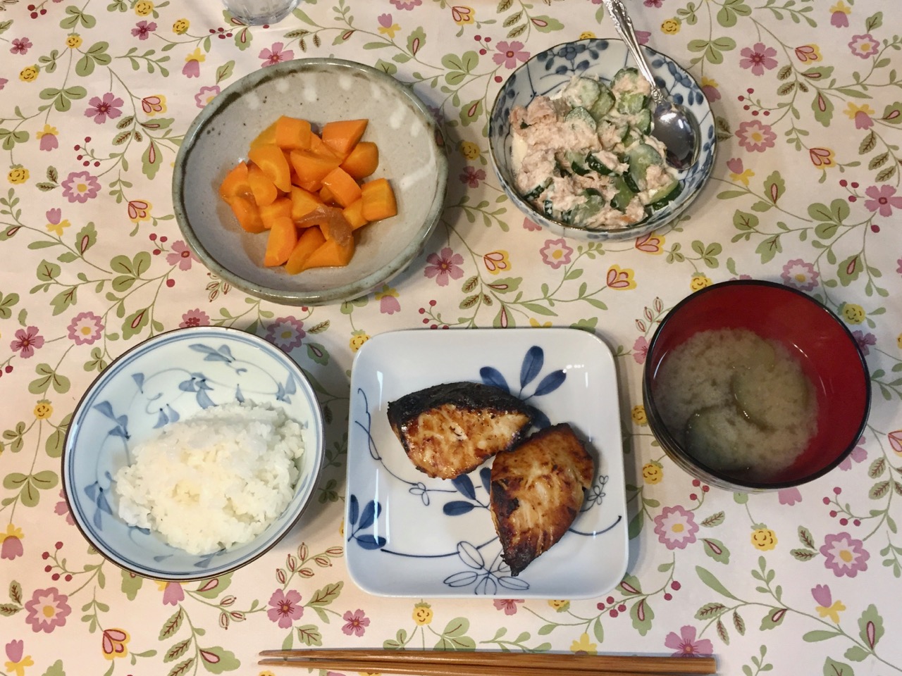 2021/04/23 晩 – 焼き魚、ツナきゅうり、にんじん、味噌汁、ご飯