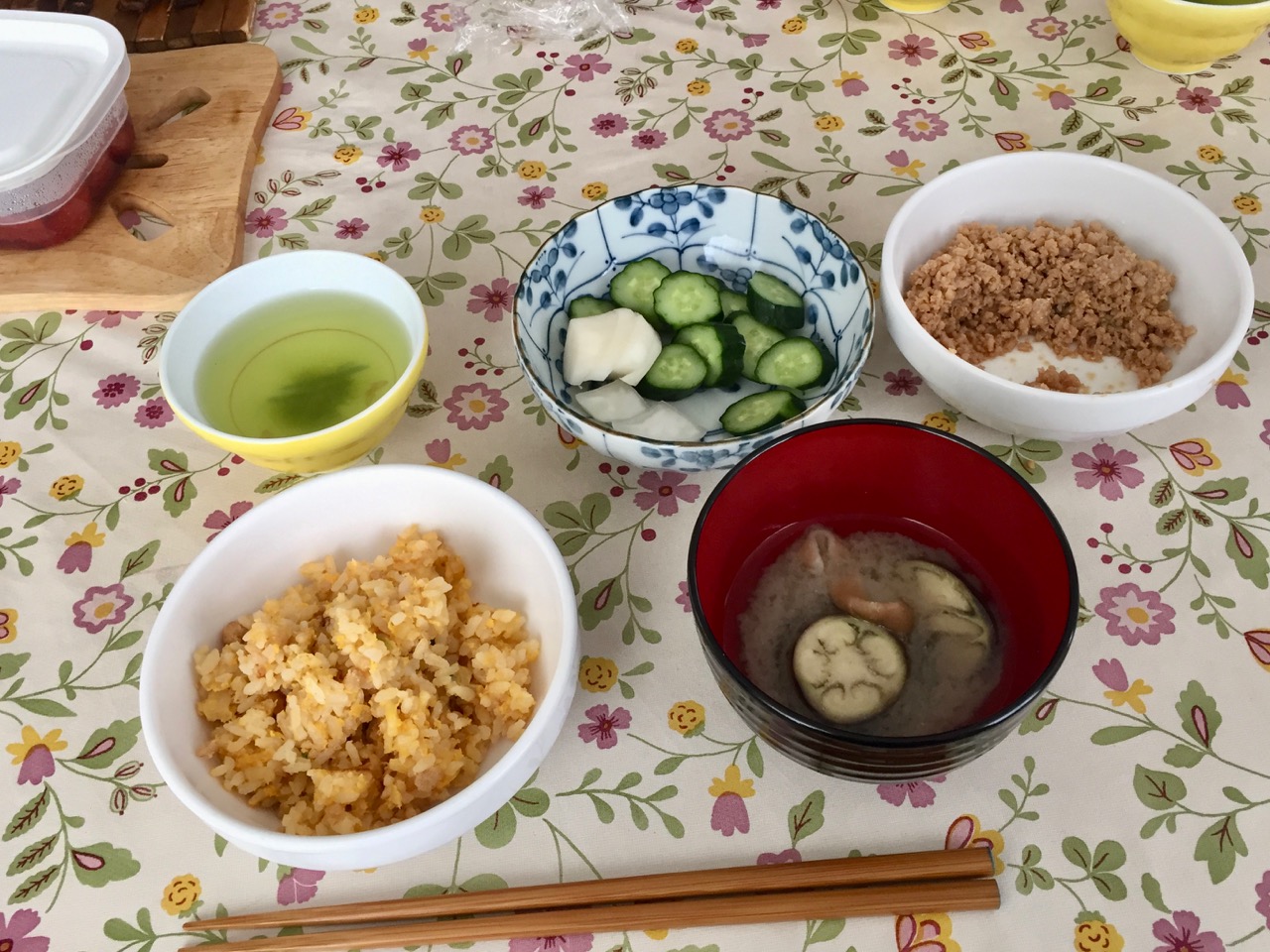 2021/04/28 昼 – チャーハン、味噌汁、鳥そぼろ、ぬか漬け