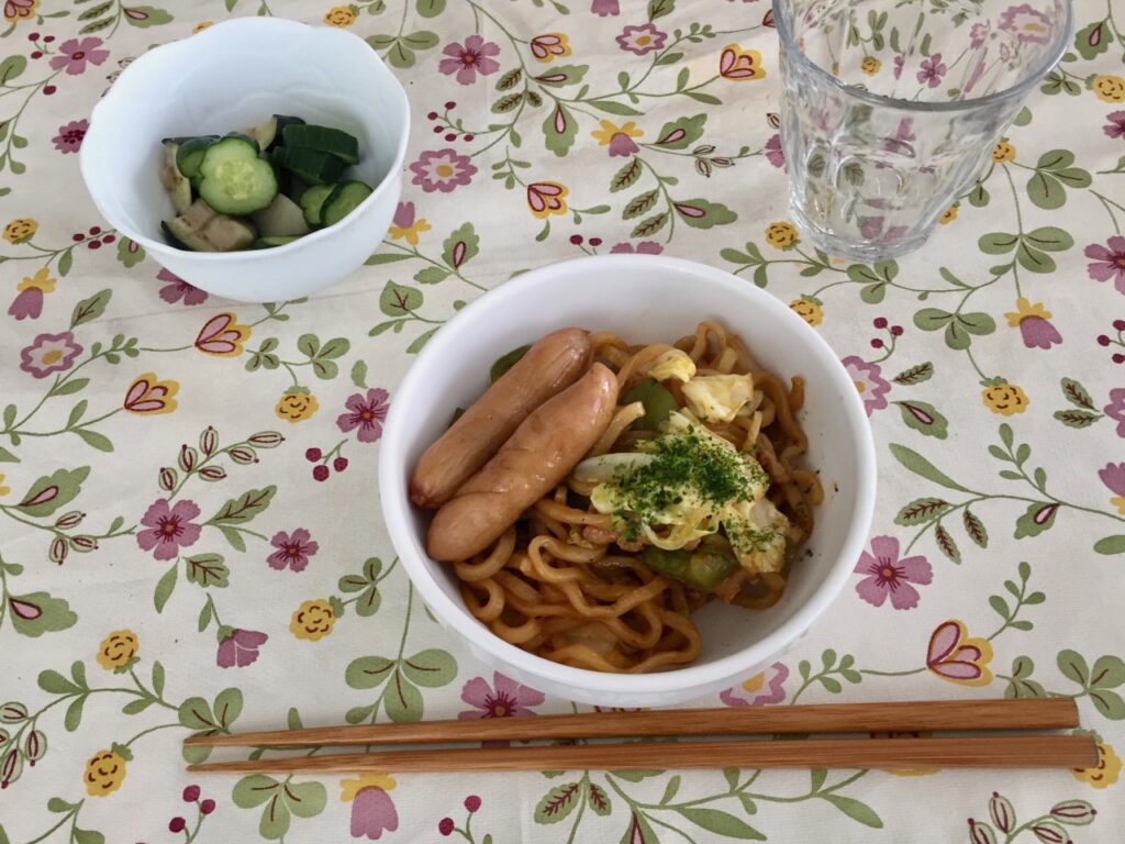 2021/05/04 昼 – 焼きそば、ソーセージ、ぬか漬け