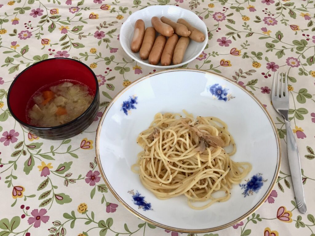 2021/04/18 昼 – きのこスパゲッティー、ソーセージ、鳥野菜スープ