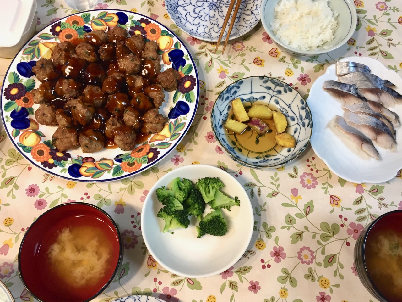 2021/04/18 晩 – 肉団子甘酢餡かけ、しめさば、サツマイモ、ブロッコリー、味噌汁、ご飯