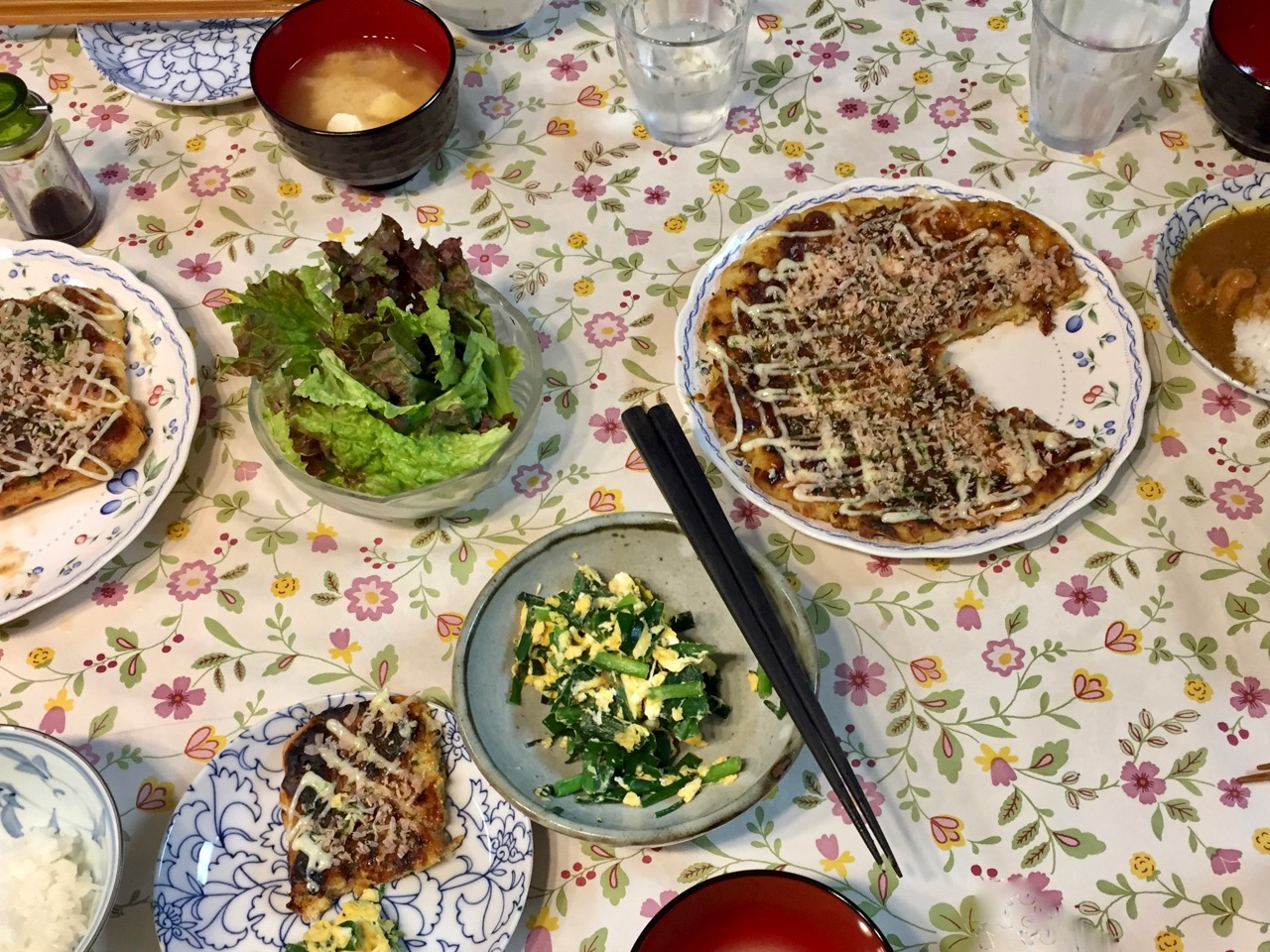 2021/05/08 晩 – お好み焼き(ソース、醤油)、ニラ玉、レタス、他