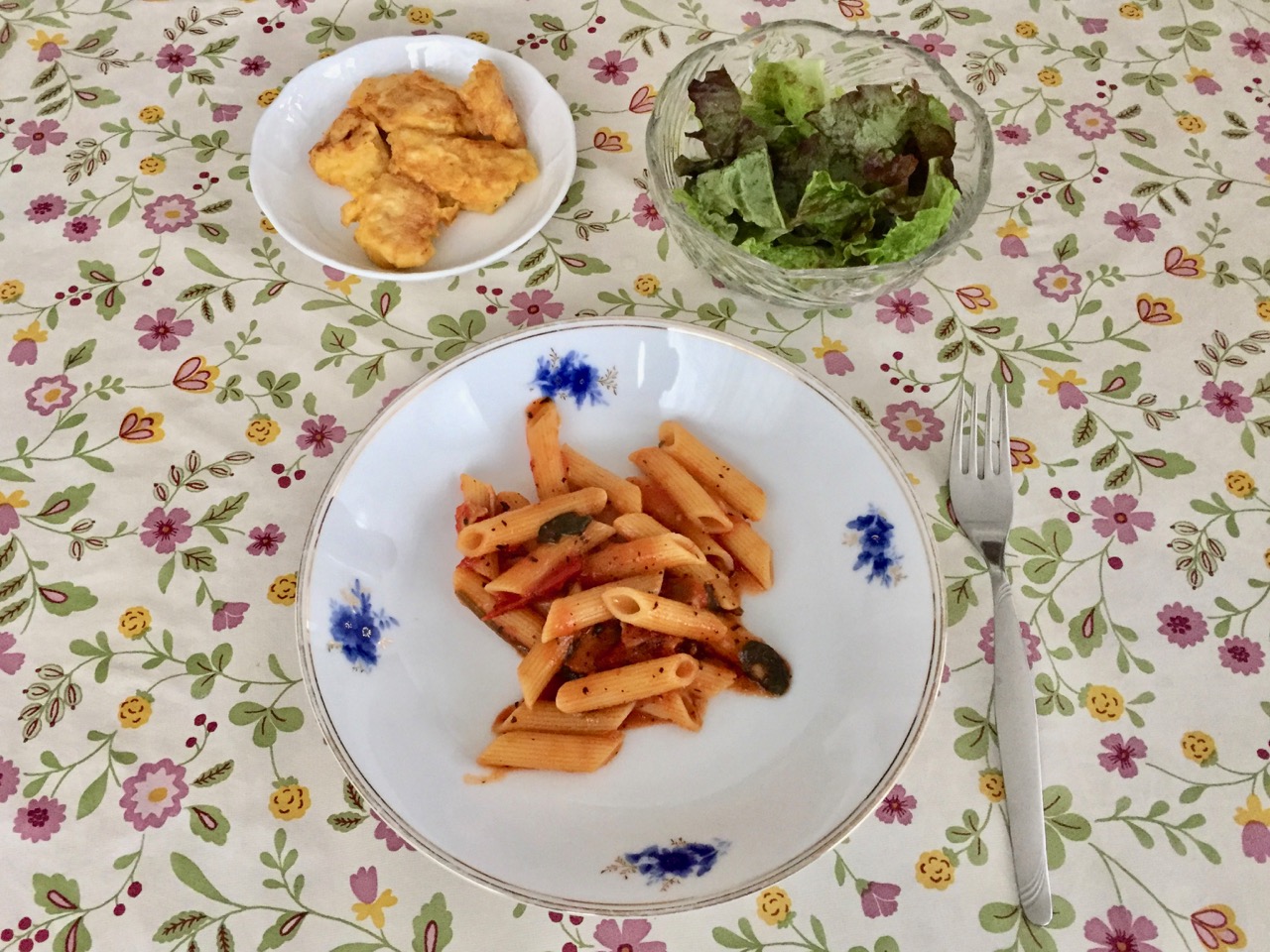 2021/05/13 昼 – トマトペンネ、チキンピカタ、レタス