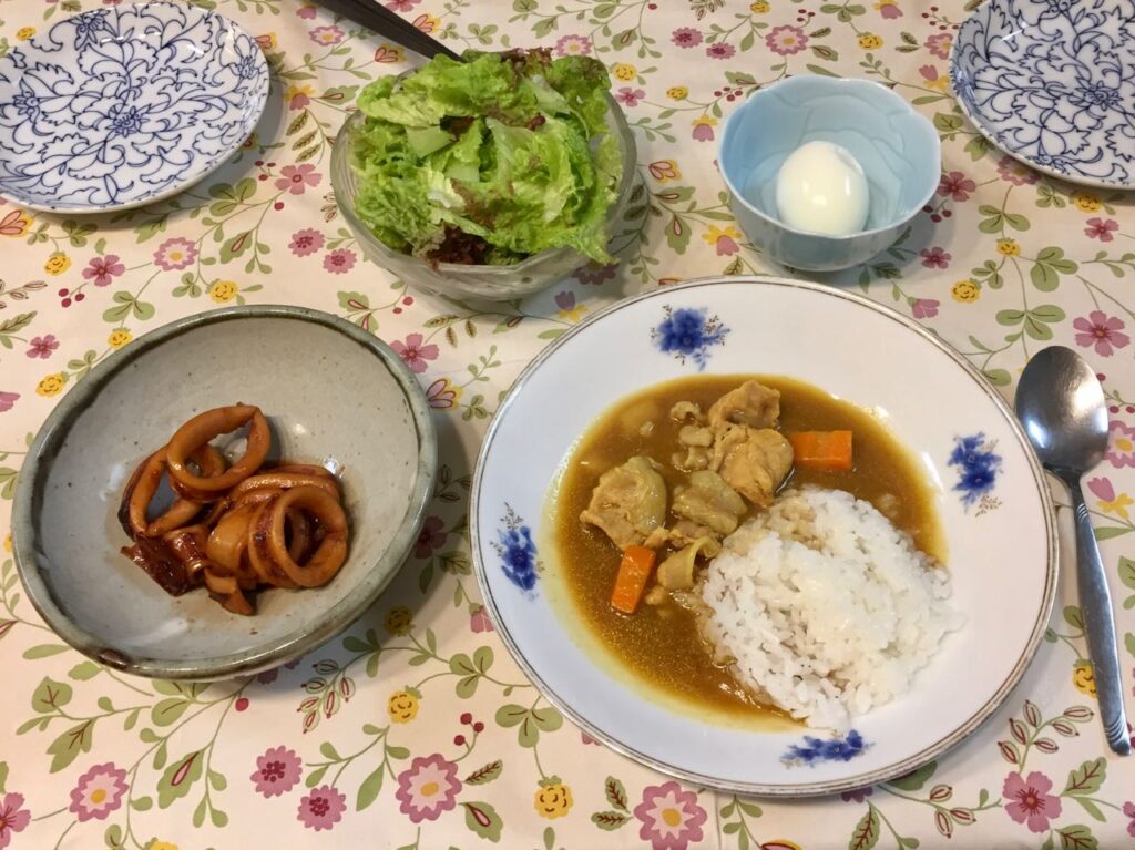 2021/05/22 晩 – 豚肉のカレー、イカの煮物、レタス、ゆで卵
