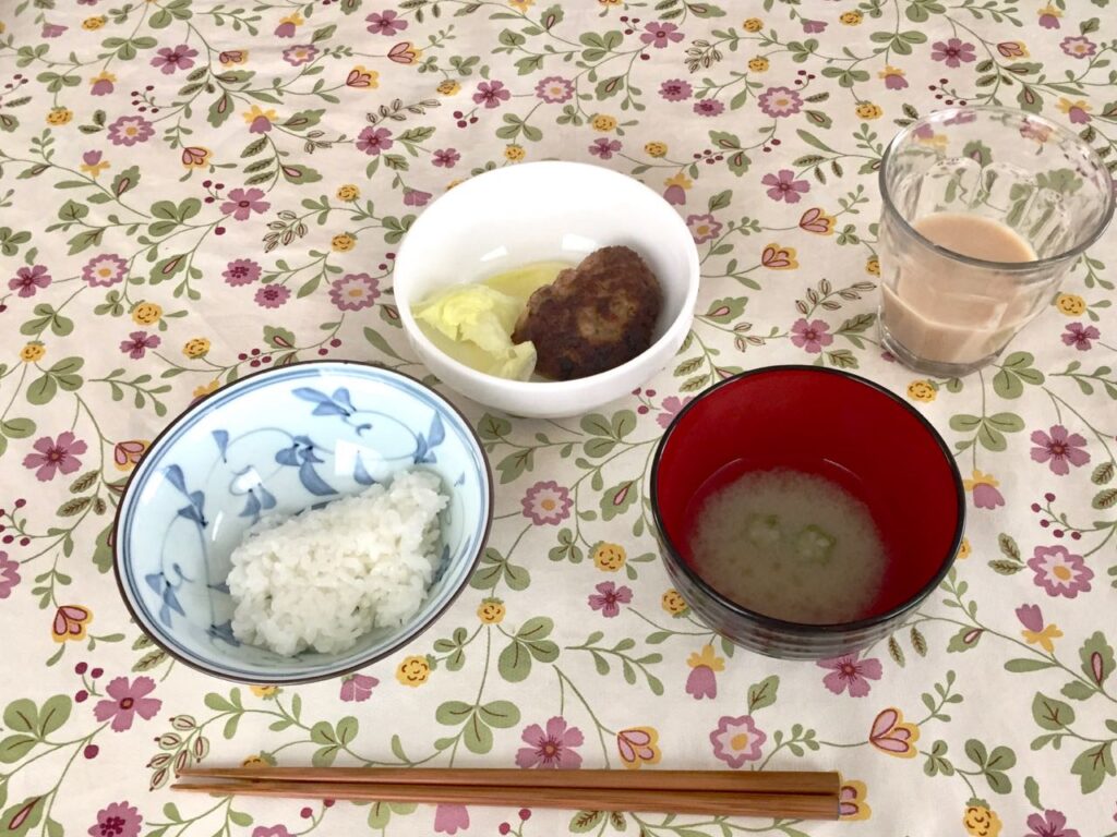 2021/05/26 朝 – ハンバーグ、レタス、味噌汁、ご飯