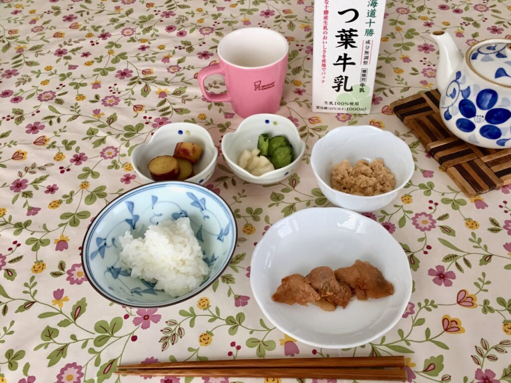 2021/04/12 朝 – 豚肉の生姜焼き、炒り豆腐、さつまいも、ぬか漬け、ご飯、(ナスの味噌汁)