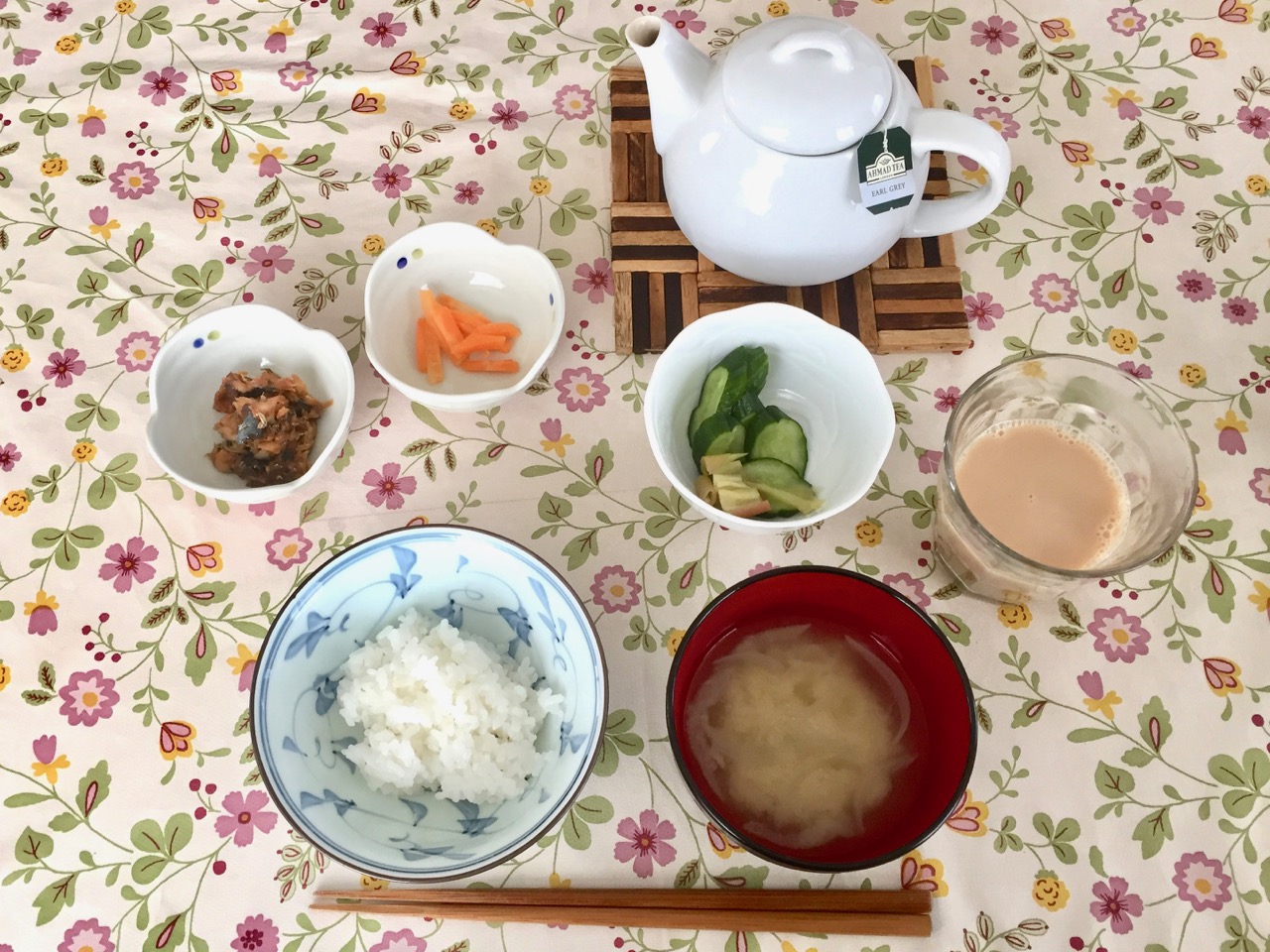 2021/04/09 朝 – いわし缶、人参、ぬか漬け、味噌汁、ご飯