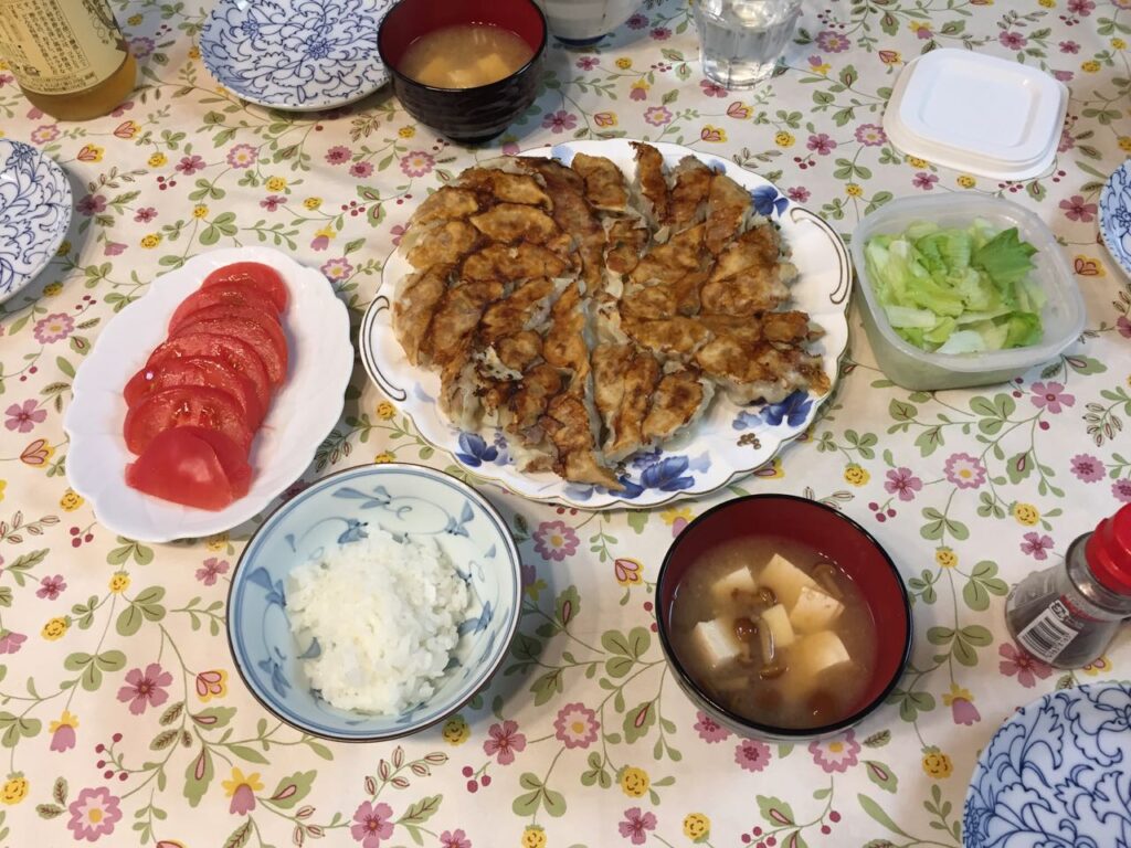 2021/05/29 晩 – 餃子、トマト、レタス、味噌汁、ご飯