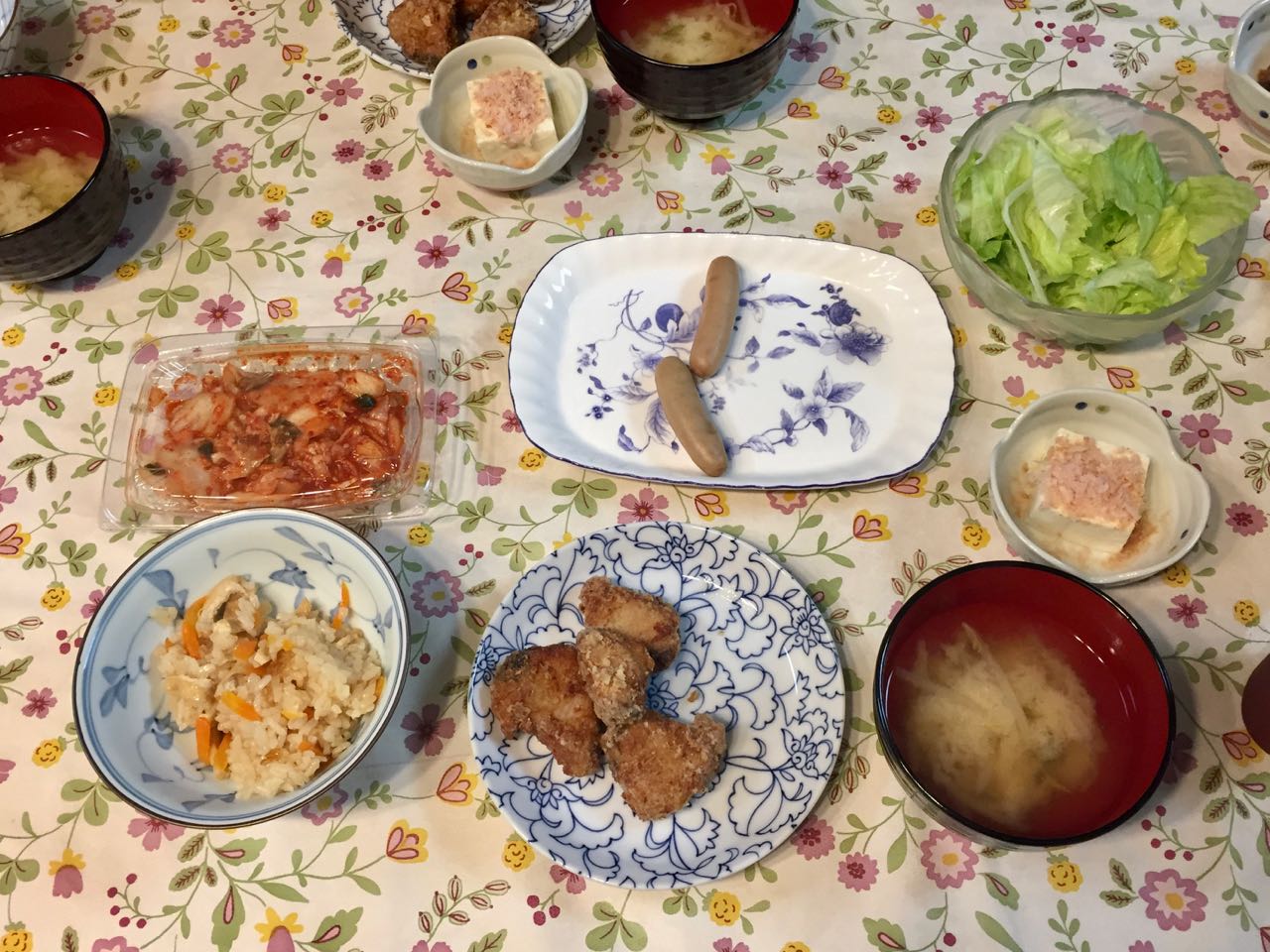 2021/05/28 晩 – 魚の竜田揚げ、ソーセージ、キムチ、レタス、豆腐、ニンジン炊き込みご飯