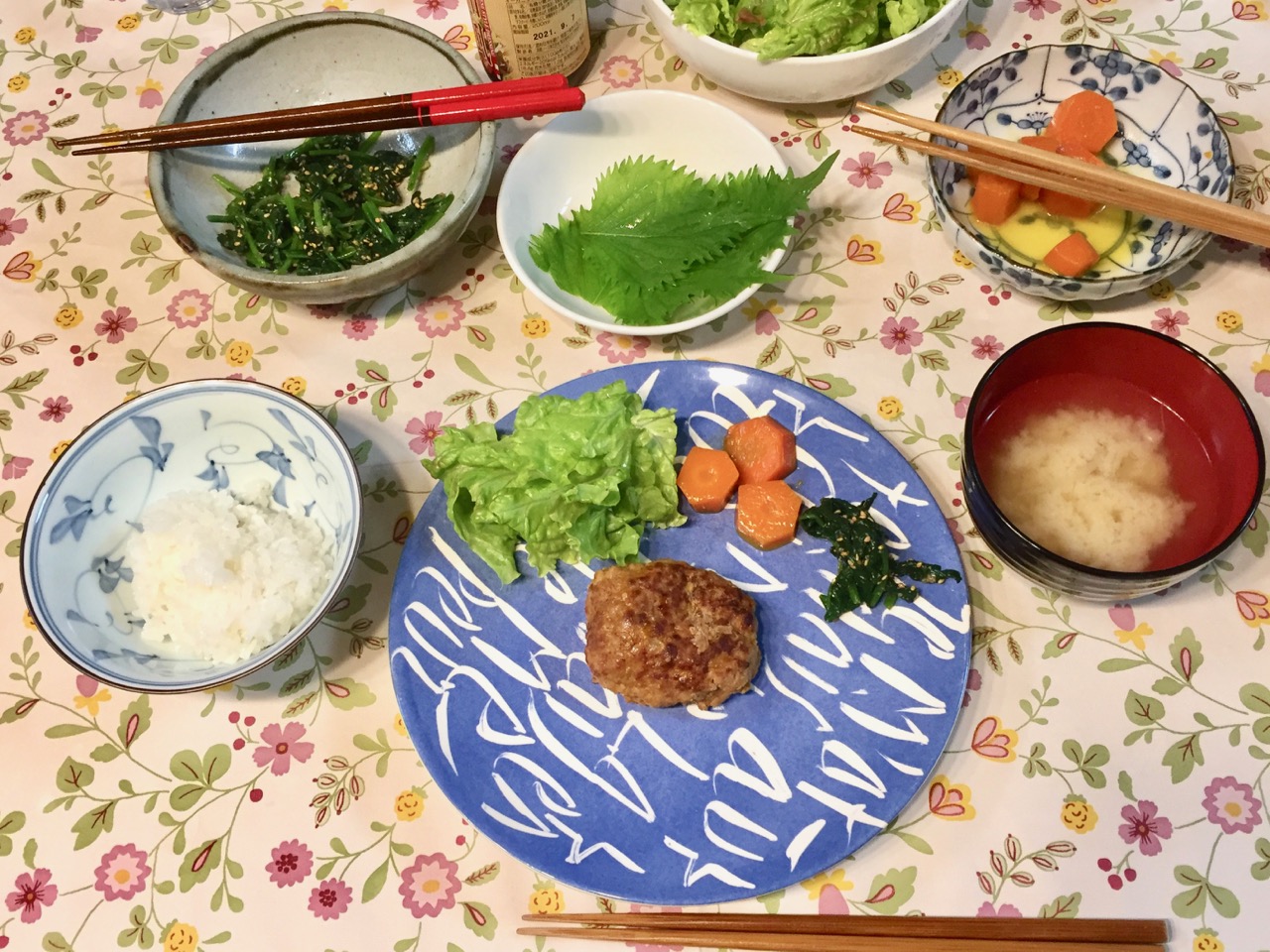 2021/04/10 晩 – ハンバーグ、人参グラッセ、ほうれん草、レタス、大葉、味噌汁、ご飯