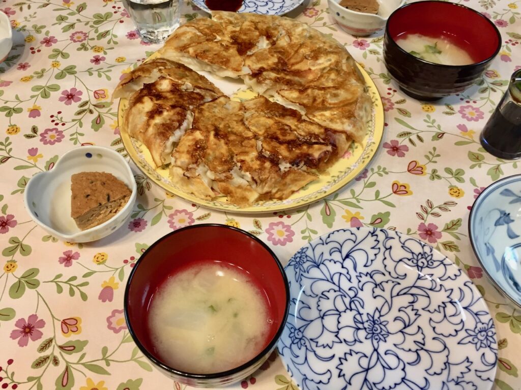 2021/04/09 晩 – 焼き餃子、がんも煮物、味噌汁、ご飯