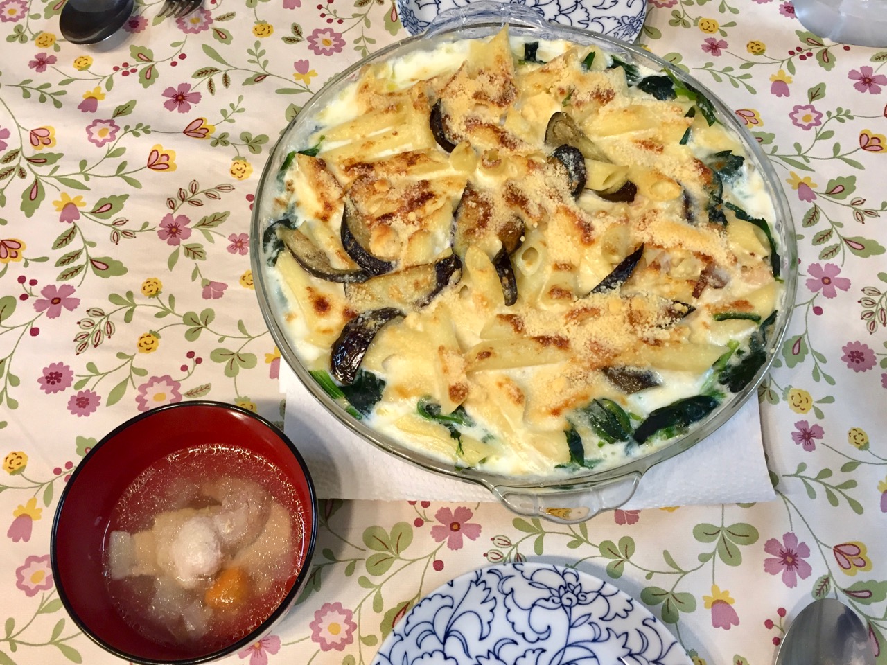 2021/04/06 晩 – マカロニグラタン、豚肉と野菜のスープ