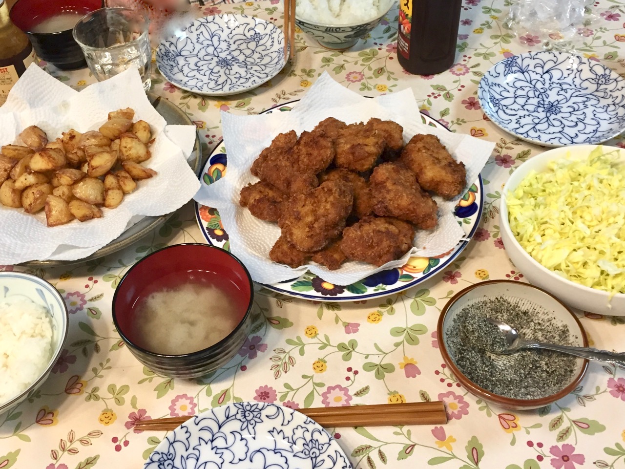 2021/04/05 晩 – ヒレカツ、フライドポテト、キャベツ、すり胡麻、味噌汁、ご飯
