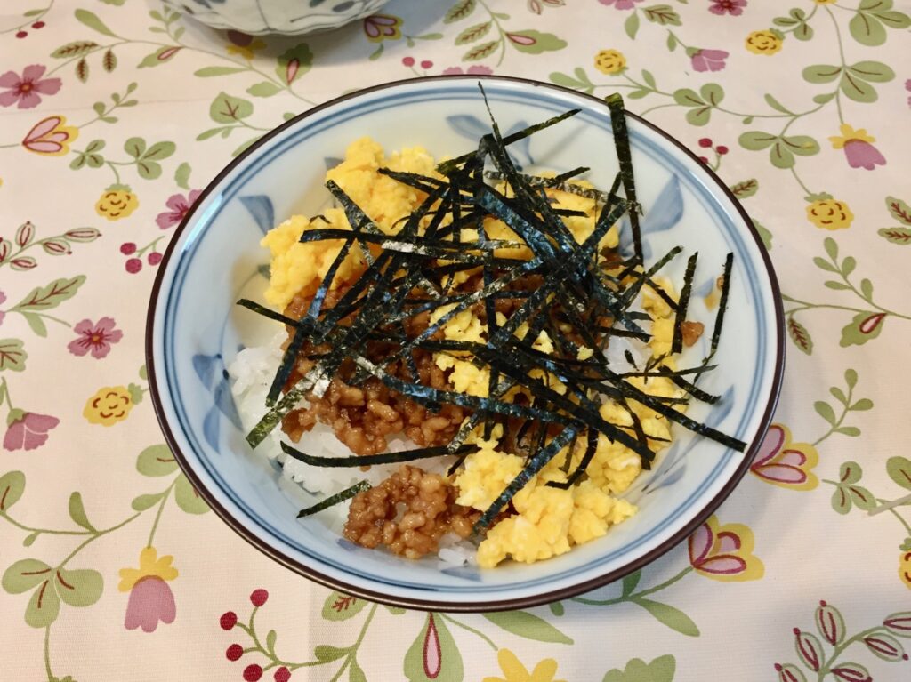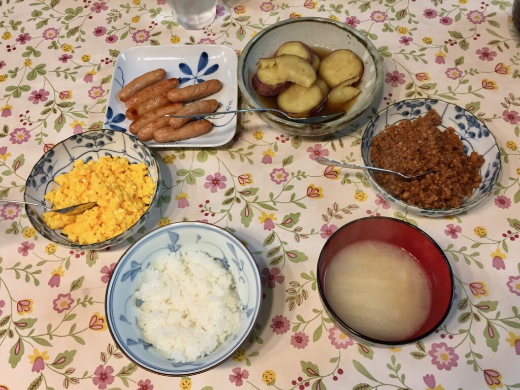 2021/04/02 晩 – 鶏そぼろ、炒り卵、ご飯、ソーセージ、さつまいも煮物、味噌汁