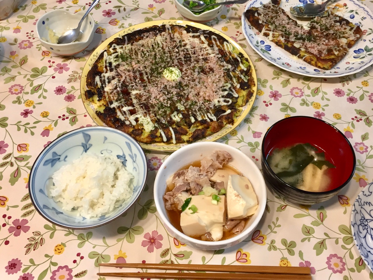 2021/04/01 晩 – お好み焼き、肉どうふ、味噌汁、ご飯