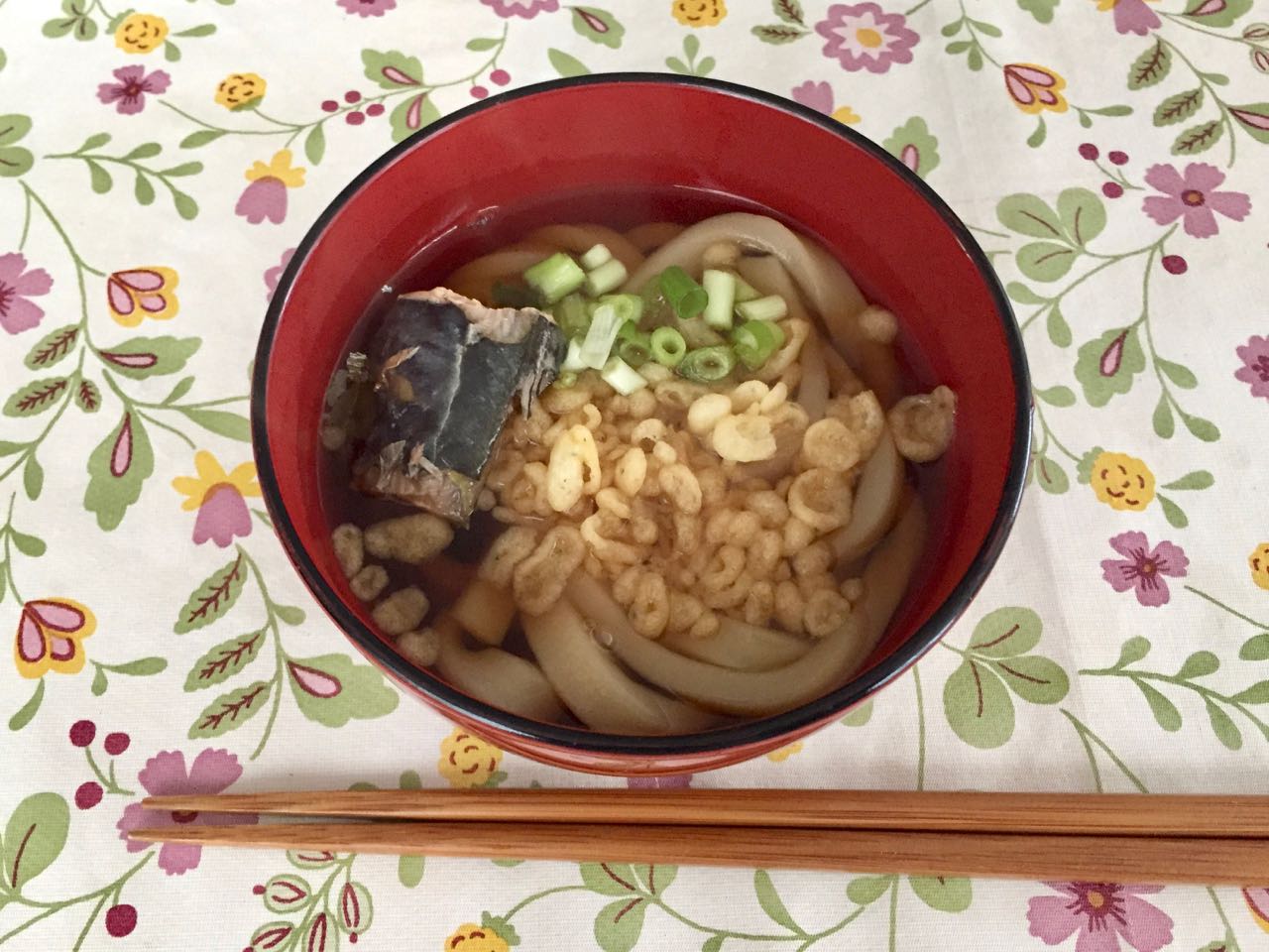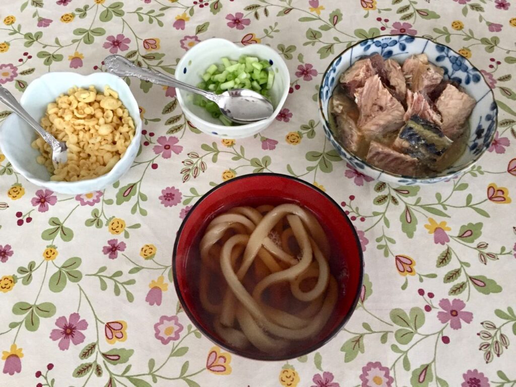 2021/05/27 昼 – うどん、揚げ玉、ねぎ、さば缶