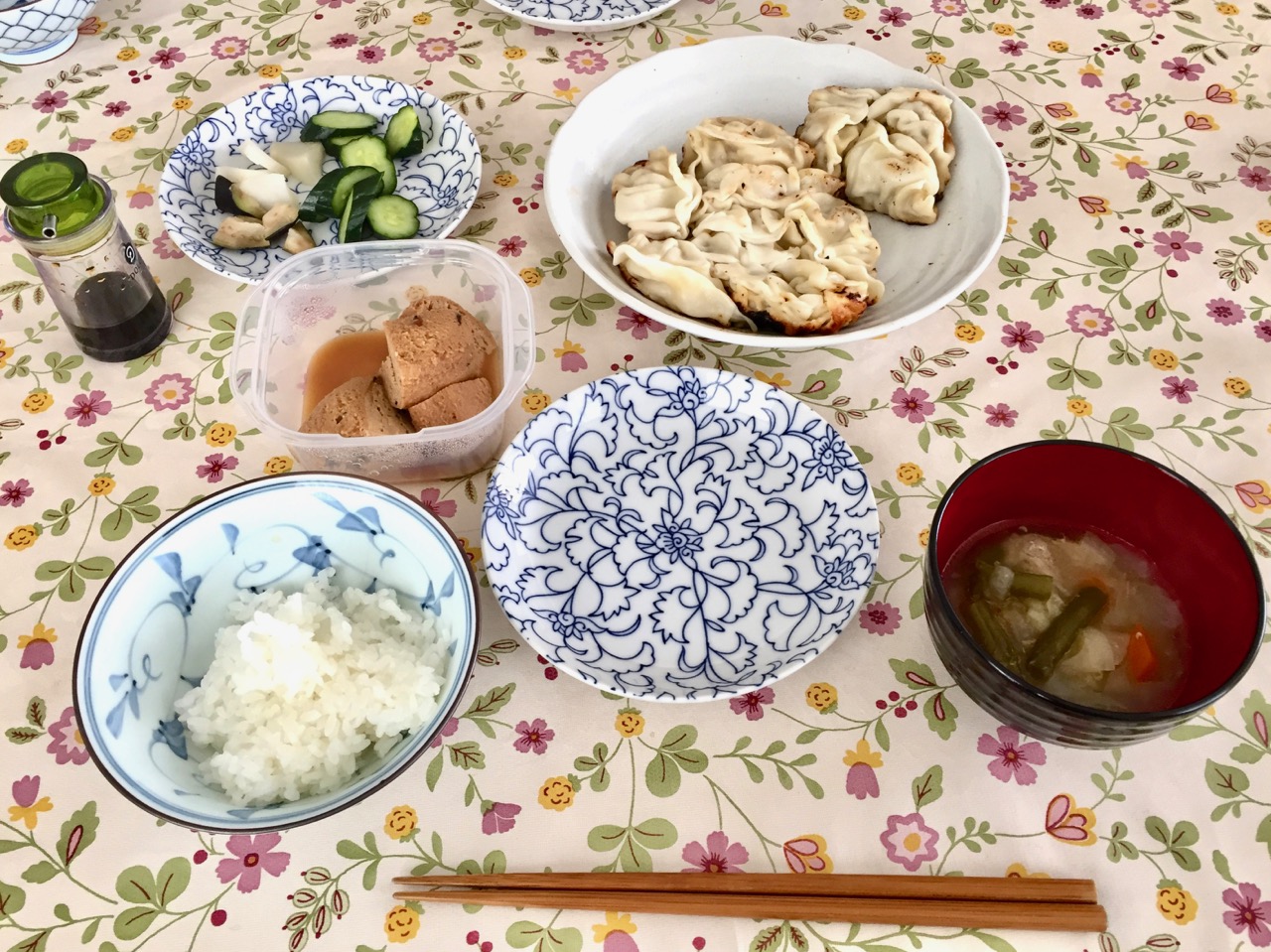 2021/04/10 昼 – 餃子、がんも、豚肉と野菜のスープ、ぬか漬け、ご飯