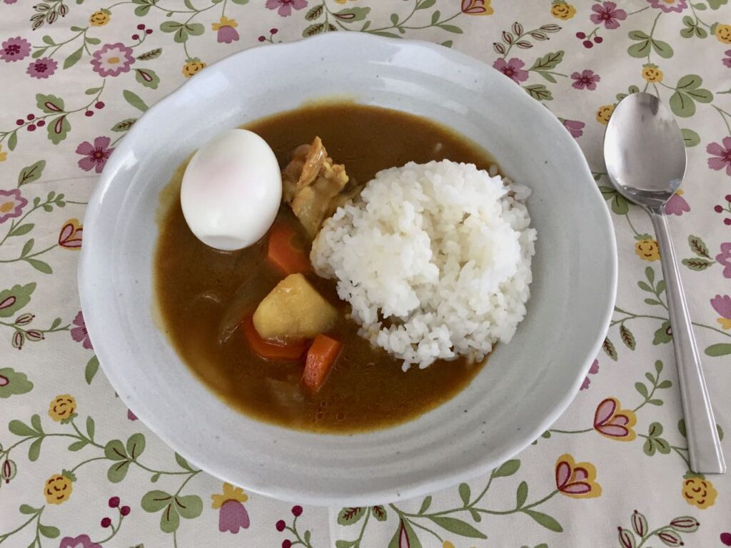 2021/05/23 昼 – 豚肉のカレー、ゆで卵、ご飯